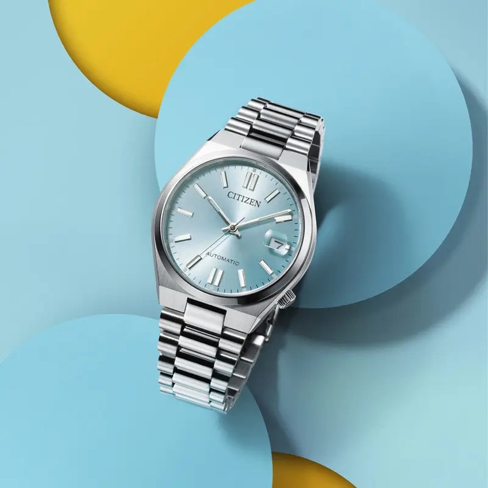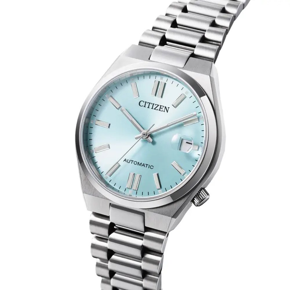 Montre de la collection Tsuyosa, mouvement automatique 3 aiguilles, dateur à 3h, cadran bleu, verre saphir, boitier acier sur bracelet acier avec boucle déployante.