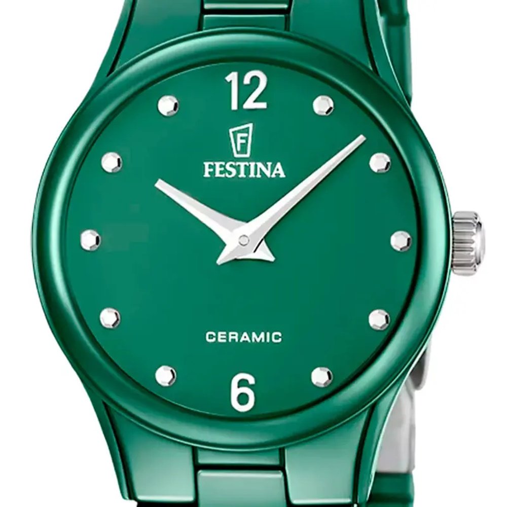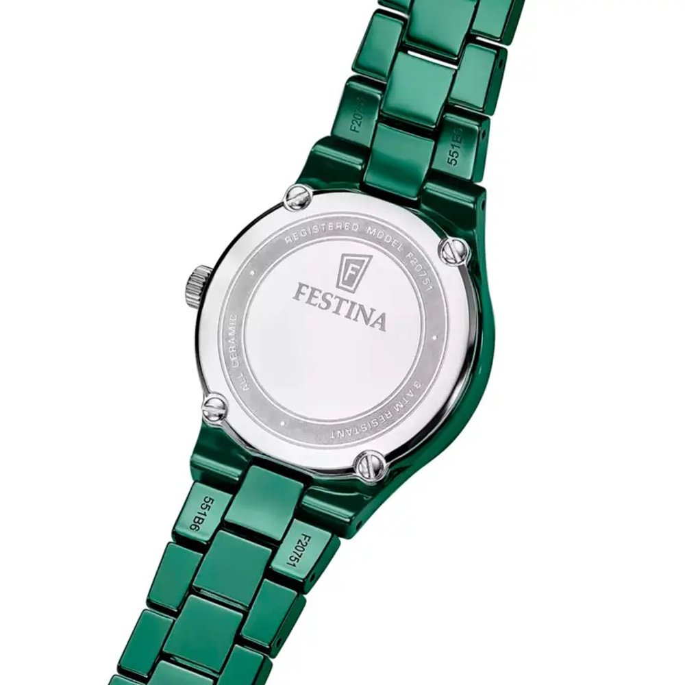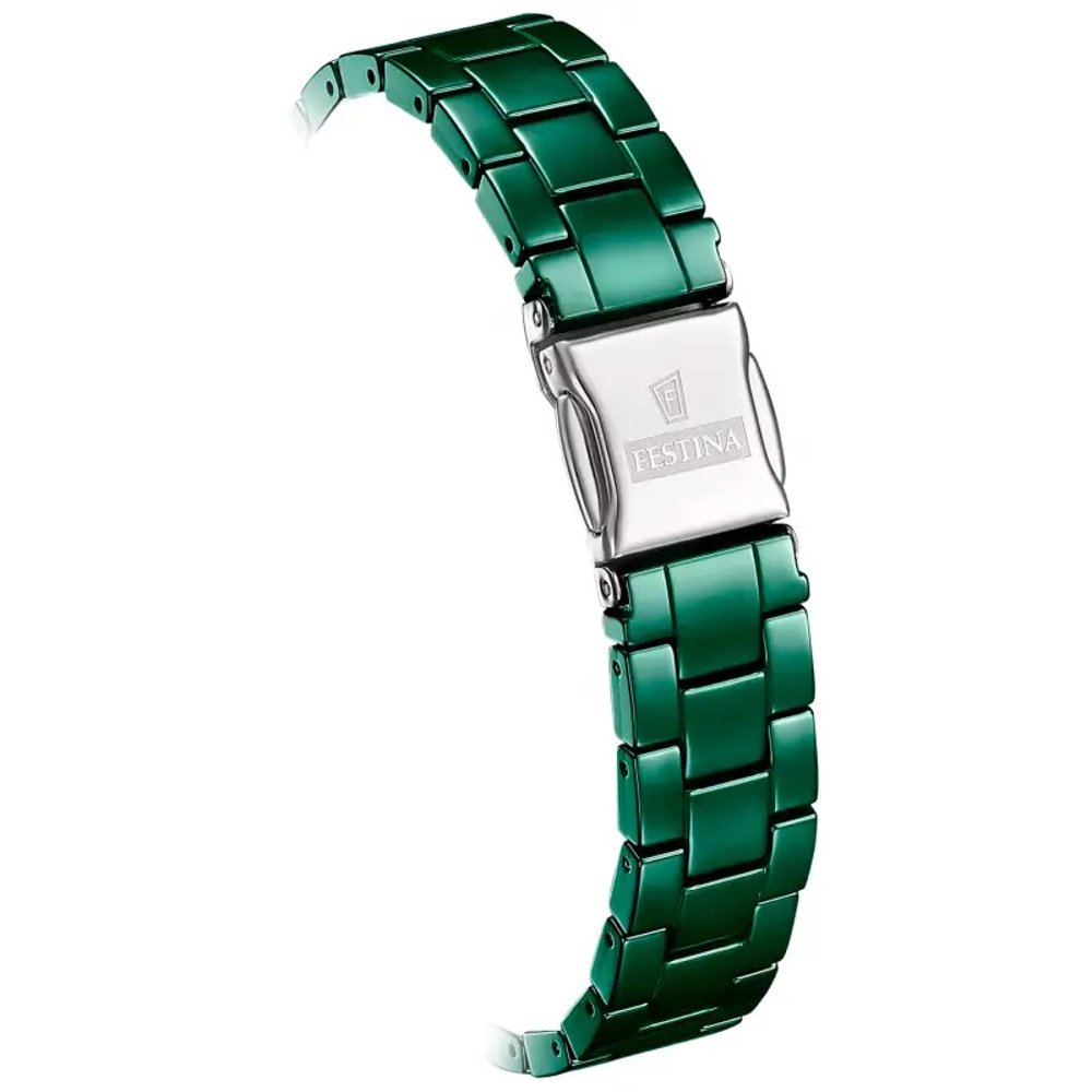 La montre Festina F20751 se distingue par sa fabrication en céramique, un matériau à la fois durable et esthétique. Sa couleur verte vibrante s’associe à une finition polie et brillante, capturant la lumière et attirant irrésistiblement le regard. Le boîtier, d’une forme ronde classique confère à la montre une élégance sobre et discrète. Avec un poids total de 68 grammes, elle est légère et agréable à porter tous les jours.