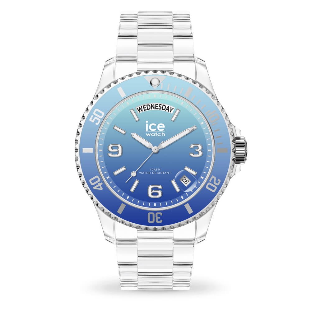 Montre de la collection Clear Sunset – Turquoise , mouvement quartz 3 aiguilles, dateur à 4h + jour à 12h, cadran multicolore , boitier en plastique transparent sur bracelet plastique transparent.
