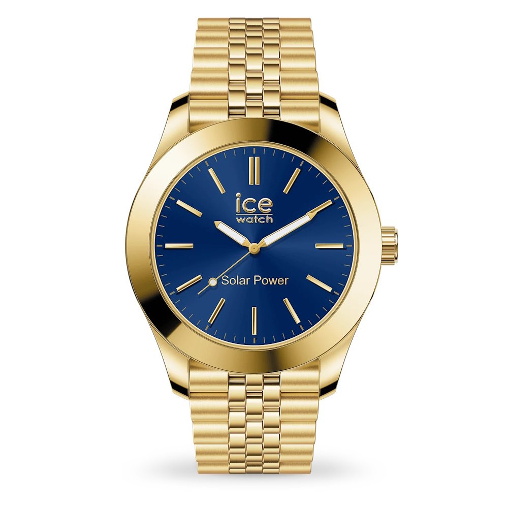 Montre de la collection Ice Steel, mouvement solaire 3 aiguilles, cadran bleu, boitier acier doré sur bracelet acier doré avec boucle papillon .