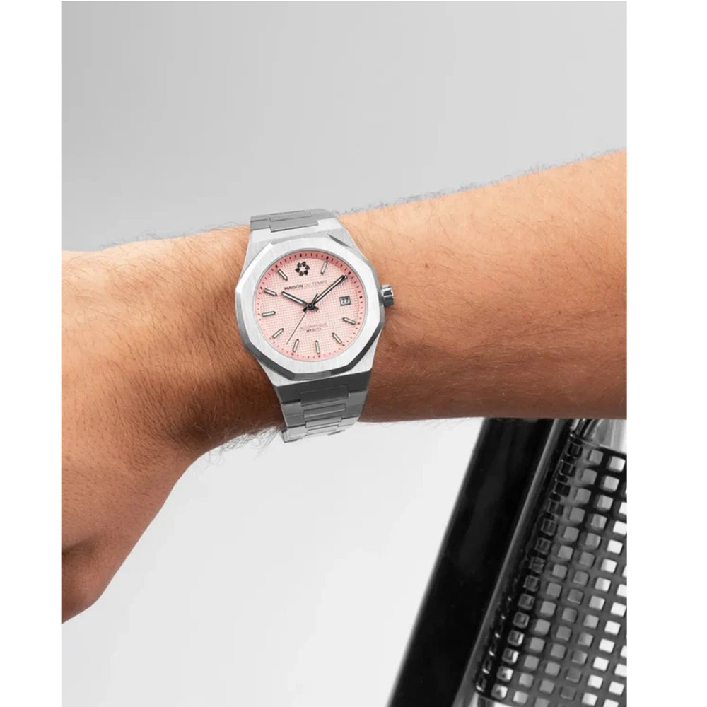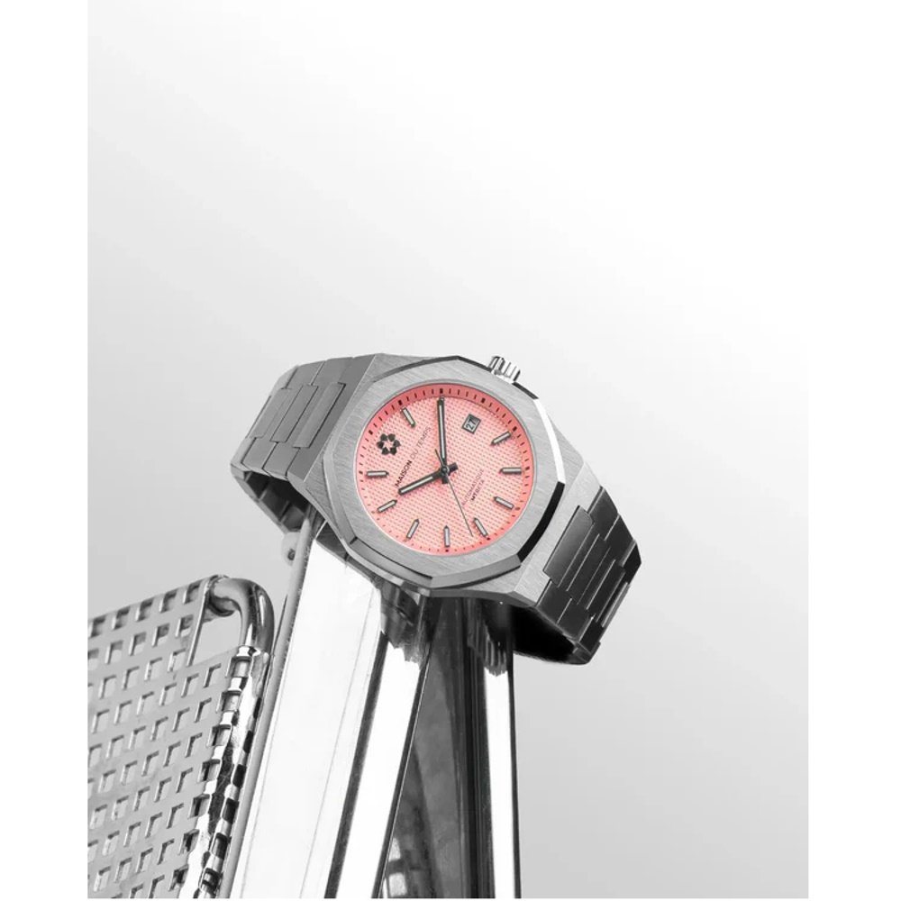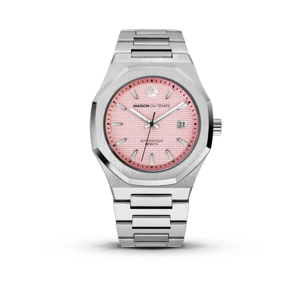 Montre de la collection MTBeta, mouvement automatique 3 aiguilles, dateur à 3h, verre saphir, cadran rose, boitier acier sur bracelet acier avec boucle déployante.
