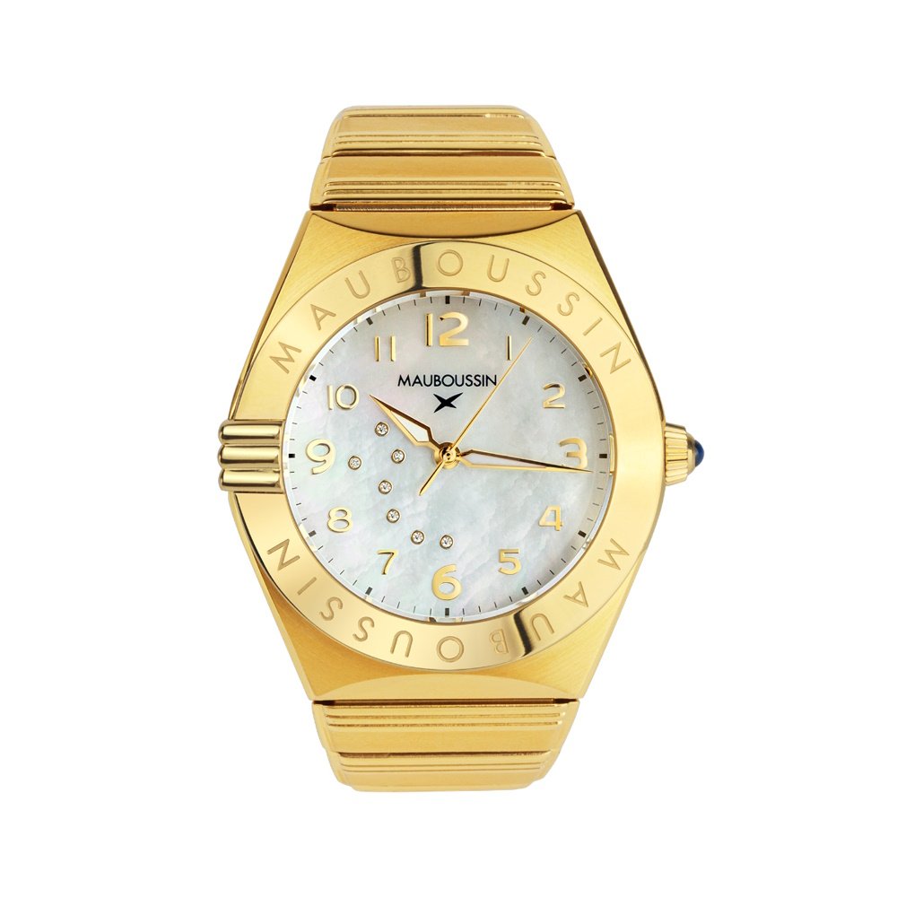 Montre de la collection 1827, mouvement quartz 3 aiguilles, cadran nacré orné de diamants, boitier acier doré sur bracelet acier doré avec boucle déployante.