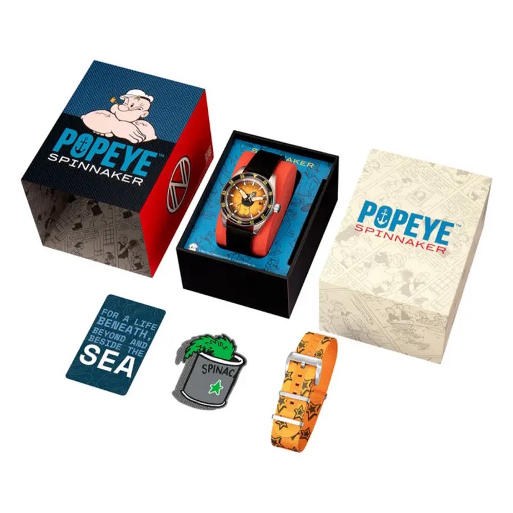 Montre de la collection Popeye, mouvement automatique 3 aiguilles, dateur à 3h, verre saphir, cadran orange, boitier acier sur bracelet silicone noir, vendue en coffret avec un bracelet supplémentaires.